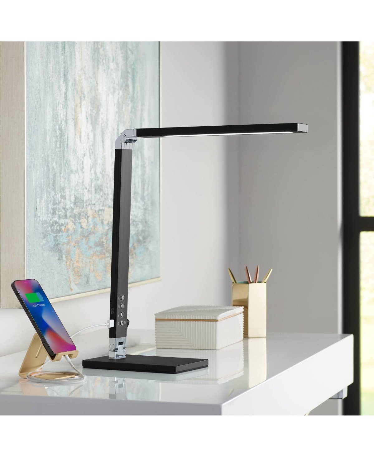 Upgrade your home office or work desk with this contemporary desk lamp from the 360 Lighting brand. With metal construction and a black finish, this lamp also features a USB port for charging phones and other small electronics. This lamp is also energy-efficient and adjustable, which makes it a great choice for your workspace.