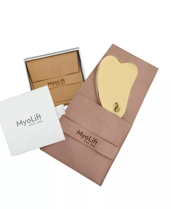 The MyoLift Gua Sha Microcurrent Device is crafted from Kansa, a metal known for its use in traditional Ayurvedic practices and composed of copper and tin. This tool is specifically designed to work with all MyoLift microcurrent devices, allowing for effective delivery of microcurrent during facial treatments. Its unique material and shape make it suitable for integrating into a variety of skincare routines focused on microcurrent technology.