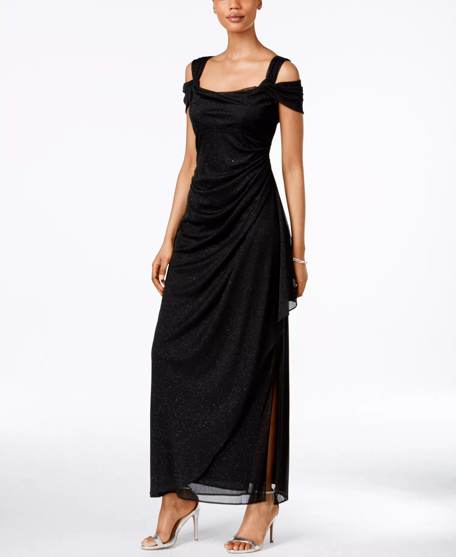 Make a shimmering style statement in Alex Evenings’ glittered dress, a dreamy look with cold-shoulder cutouts and pretty draping. Amp it up with silver-toned heels!