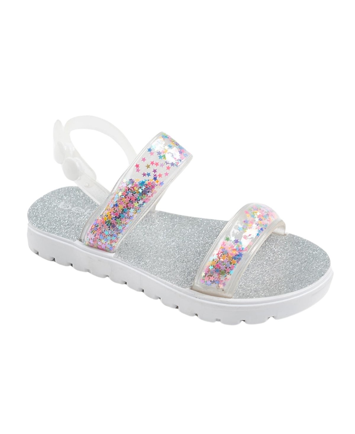 These cute sandals feature loose glitter straps that sparkle with every step. The secure back strap keeps them in place, and the easy strap closure makes them simple to put on and take off. Perfect for playtime or outings.