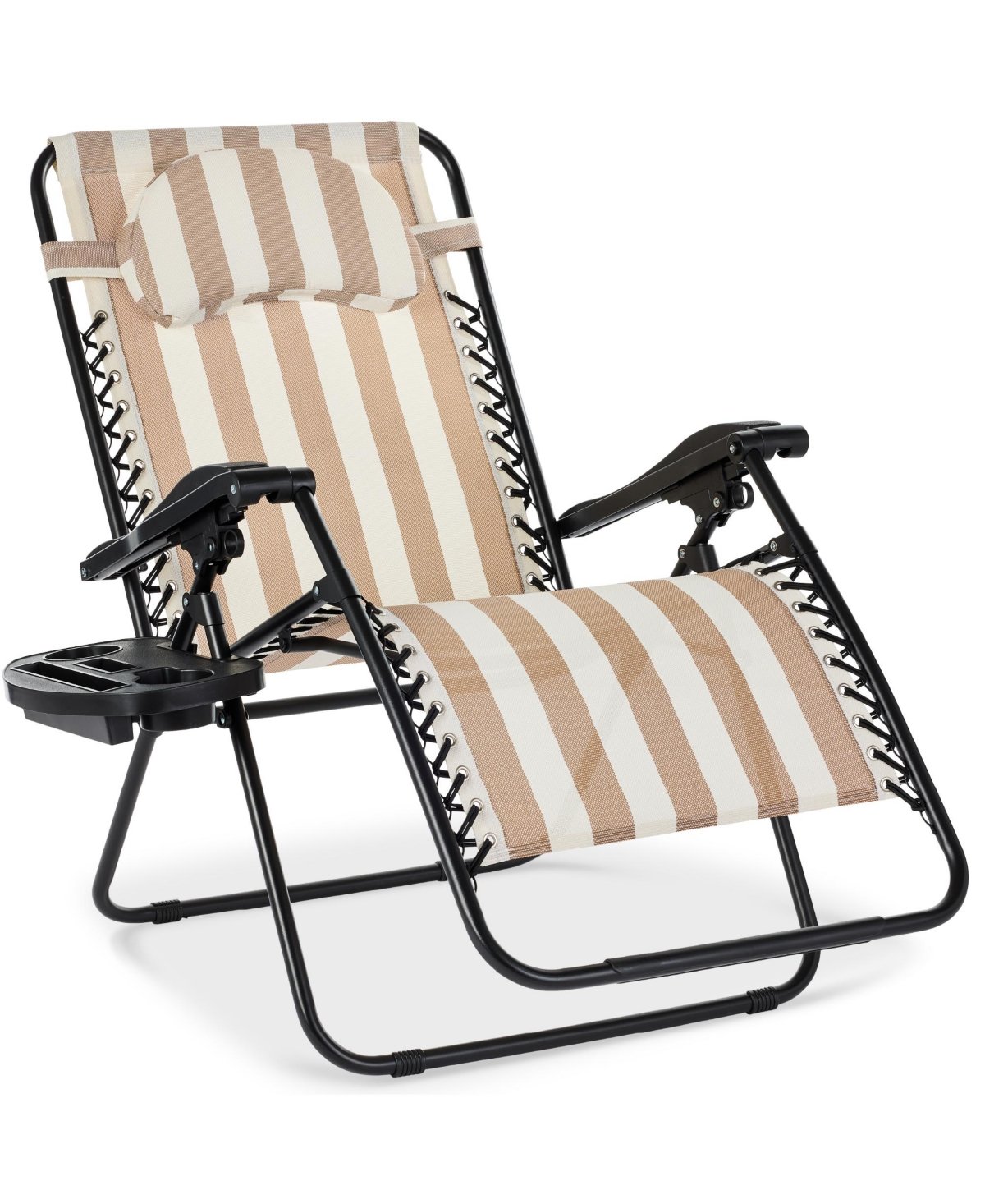 An oversized (29.75″ at the seat, 24.25″ at the backrest)steel frame features sturdy armrests for added support. Built with an adjustable lock system to freely move the back and footrests into the perfect angle, up to 160-degrees. Keep your favorite drinks and media devices close at hand for uninterrupted relaxation. The lightweight, folding design makes this chair easy to carry to your next outing!
