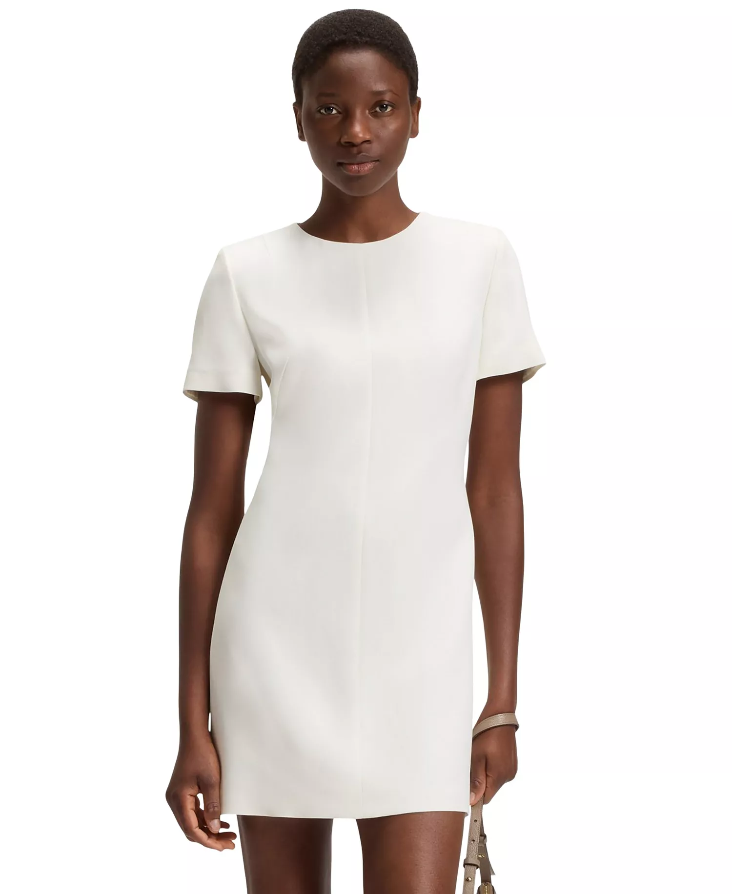 Cut with a simple silhouette in soft crepe, this BOSS Womenswear dress is so easy to style. Neat rear zip with logo puller. Short sleeves.