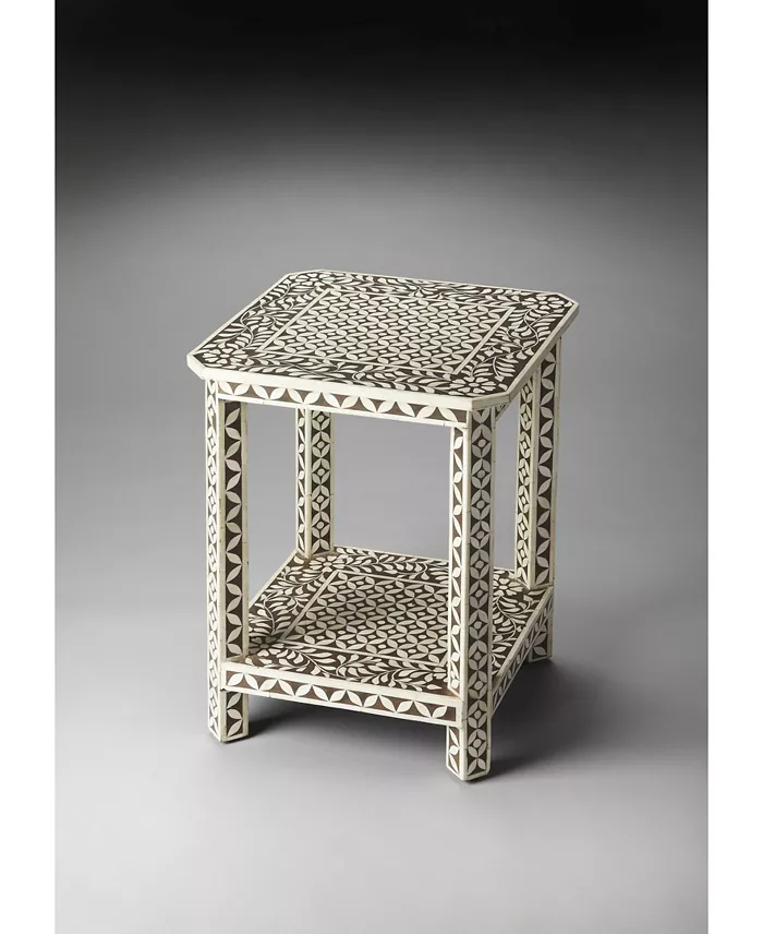 Add this table to your favorite powder room, guest room or relaxing corner! This accent table has a beautifully intricate design with elegant square shape and hand inlay craftsmanship on aprons, uprights, shelf and table top. Truly an uncommon piece of art.