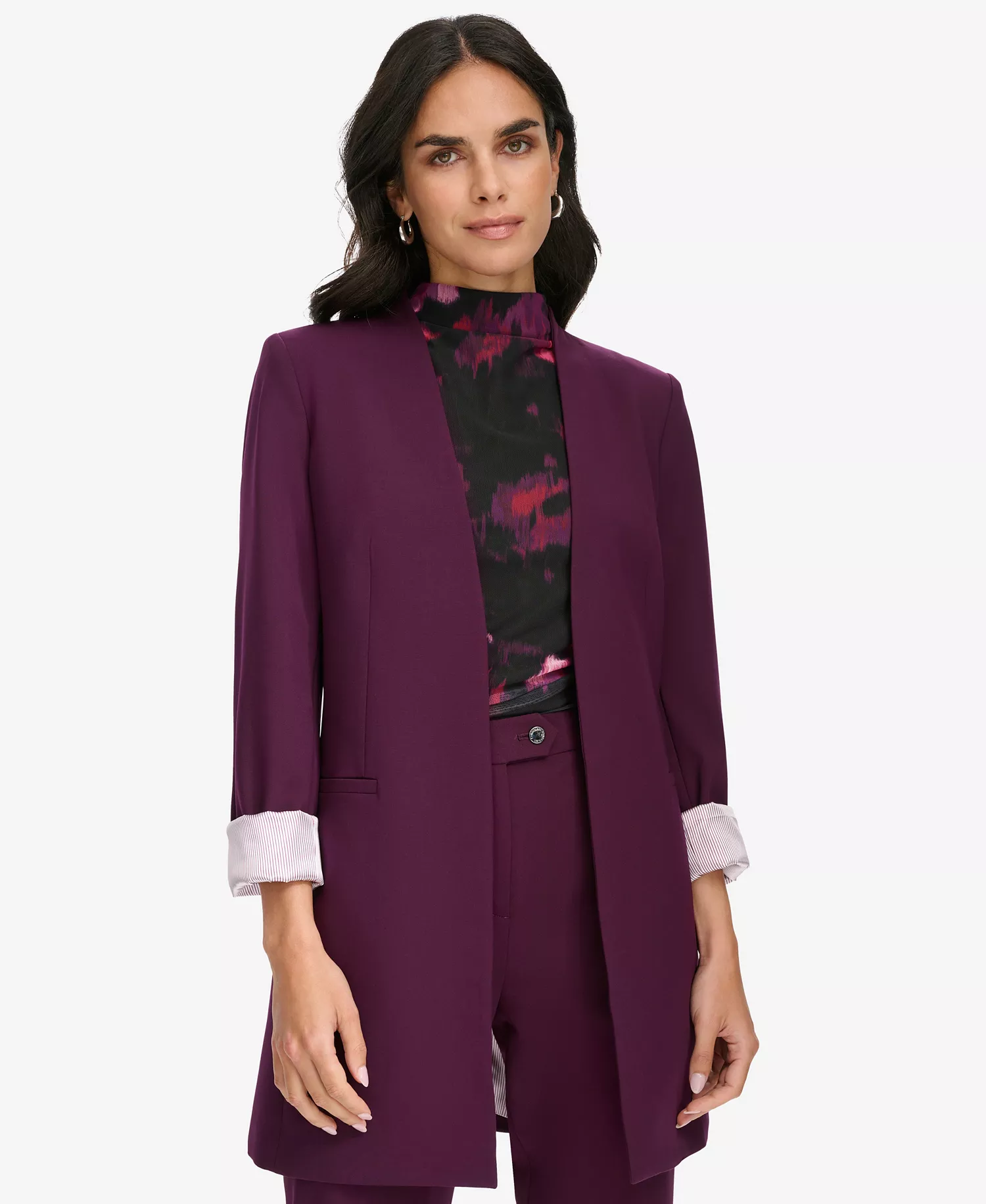 Adopt a sleek, practical style with this Calvin Klein jacket, featuring an open front neckline. Two front pockets and long shoulder padding provide utility and structure, while rollback cuffs add subtle detailing.