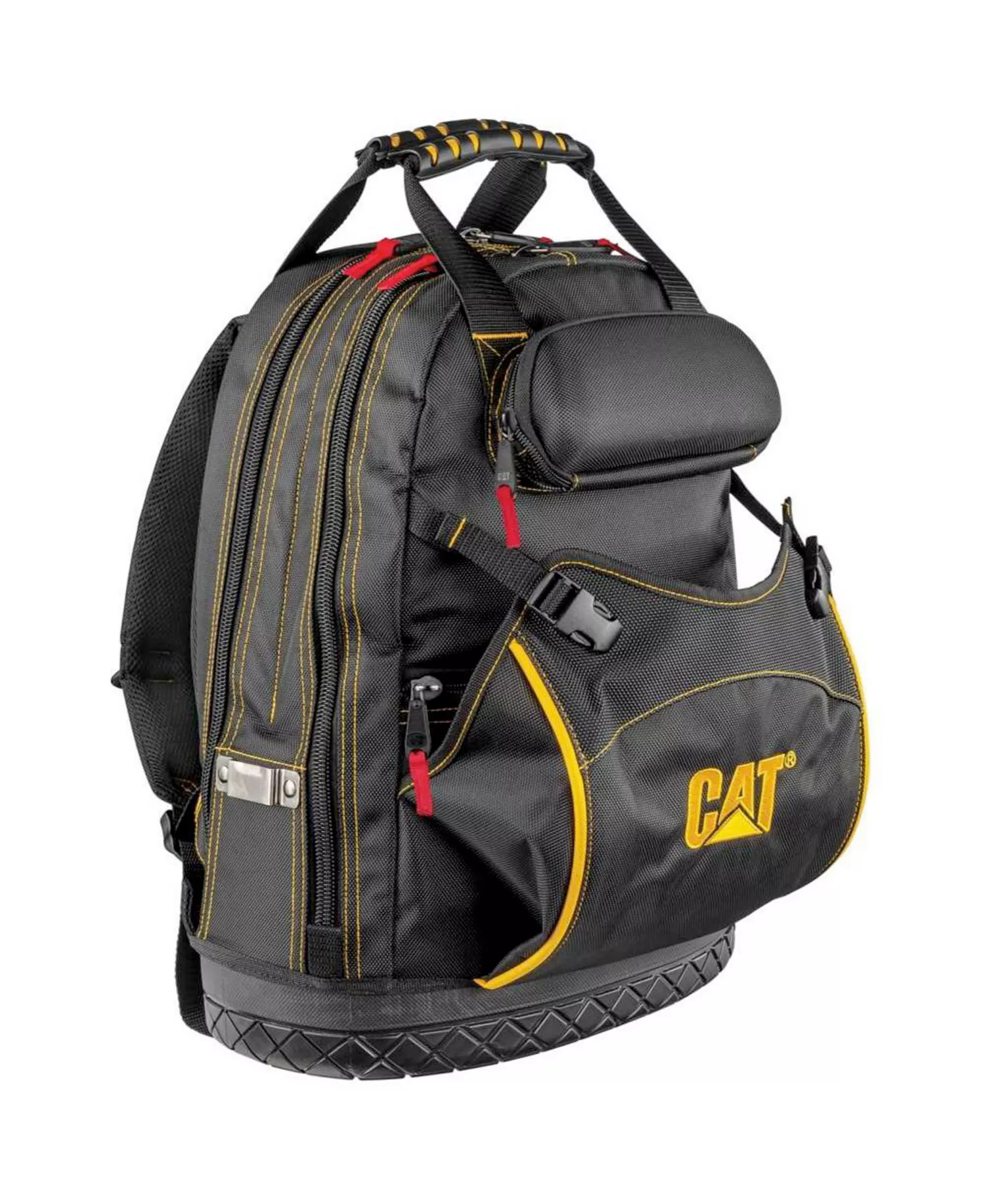 Designed for maximum efficiency with 28 interior pockets (5 extra-deep for long screwdrivers) padded laptop compartment large front pouch with quick-connect closures hard shell exterior pocket for electronics or eyewear, 16 elastic tool loops 2 adjustable hook and loop straps and tape measure clip