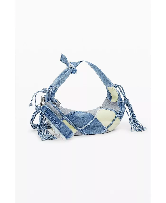 Patchwork-style handbag with a combination of fabrics, logo detail, and frayed seams.