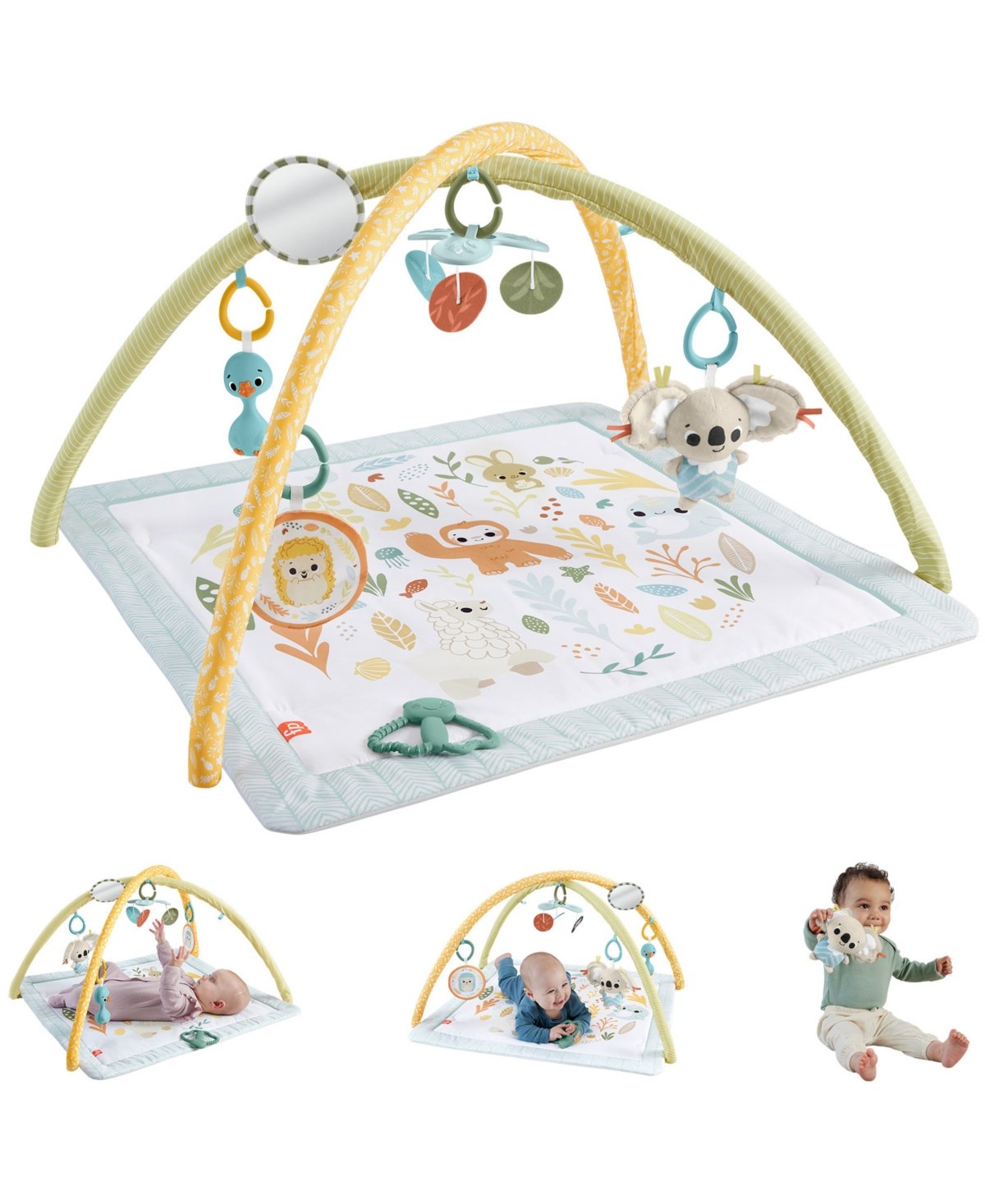 The Fisher Price Simply Senses Newborn Gym is a colorful baby activity mat that grows with your little one from lay play and tummy time to travel. The gym features an arch with 6 repositionable sensory toys including a portable plush koala with a soft chime and a take along mobile that can be attached to a stroller for fun on the go. Other sensory toys include a self-discovery mirror, goose rattle, BPA free moth teether and soft crinkle toy that can be repositioned on the gym arch or used for travel play.