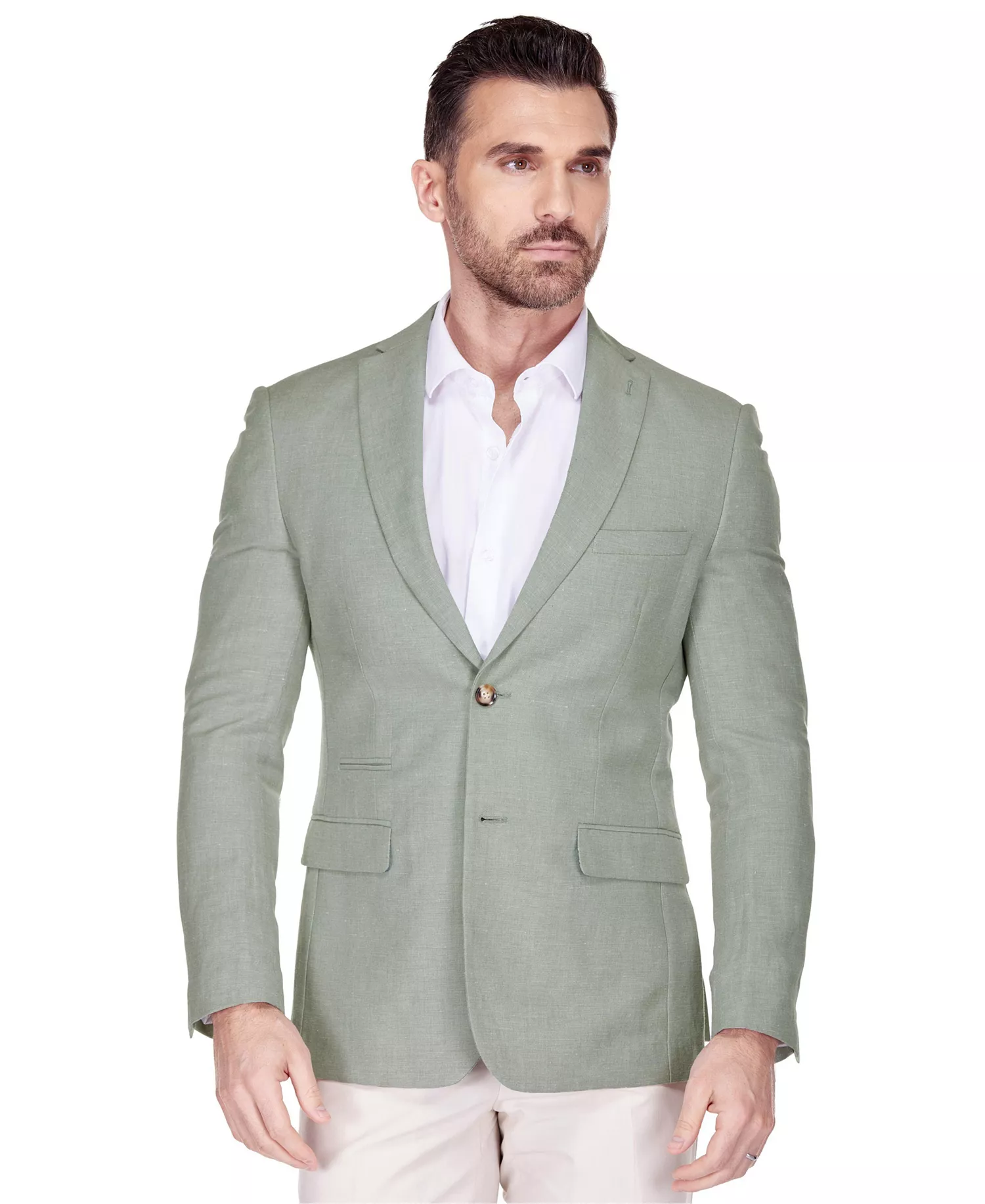 Stay cool and stylish during warm-weather occasions with the Gino Vitale Slim Fit Linen-Blend Blazer. Crafted from a lightweight, breathable linen-blend fabric, this blazer is perfect for summer weddings, outdoor events, and casual gatherings. It features a sharp slim-fit silhouette, two-button closure, and classic lapels. Thoughtful details include front flap pockets, a ticket pocket, back vents for added comfort, and an interior pocket for convenience. A versatile choice that brings effortless sophistication to any look.