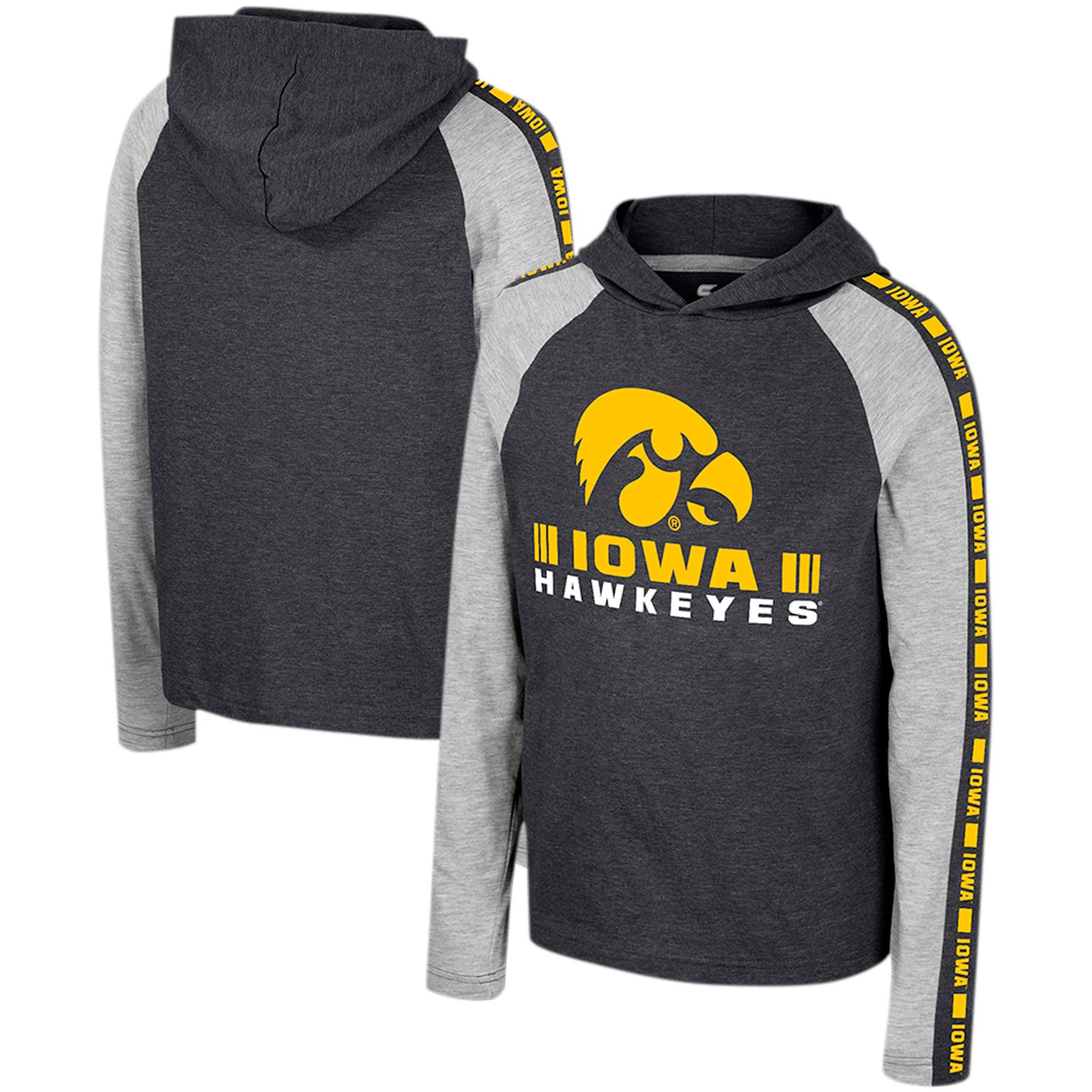 Let young fans show off their Iowa Hawkeyes pride in sporty style with this Colosseum Youth Ned Raglan Long Sleeve Hooded T-Shirt in Black. Designed with a bold Hawkeyes logo and team wordmark across the front, this top delivers a standout look that is perfect for school, casual outings, or cheering on the team.