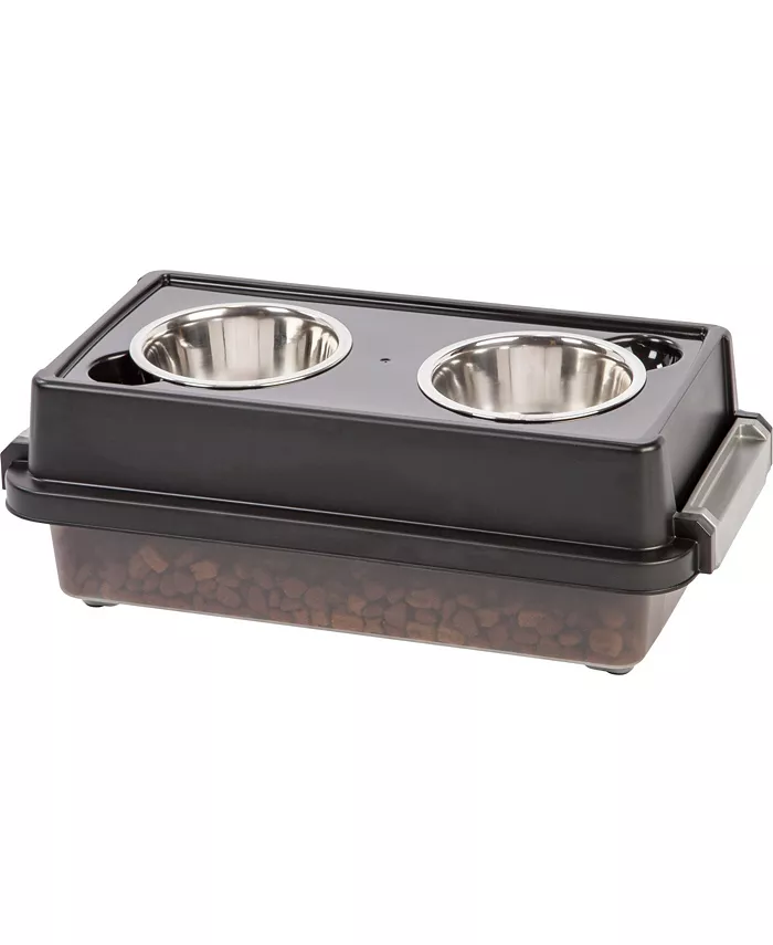 Keep your dog s food fresh with this dog food storage container with bowls. The built-in airtight food container ensures moisture is kept out, preserving the quality of dry food. The secure buckle design prevents spills, making feeding time mess-free