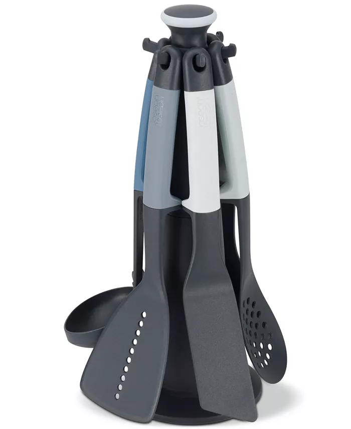 Eliminate messy work services with the Elevate kitchen tool set by Joseph Joseph, featuring six most-used kitchen utensils displayed in a sleek rotating carousel for quick-grab convenience.