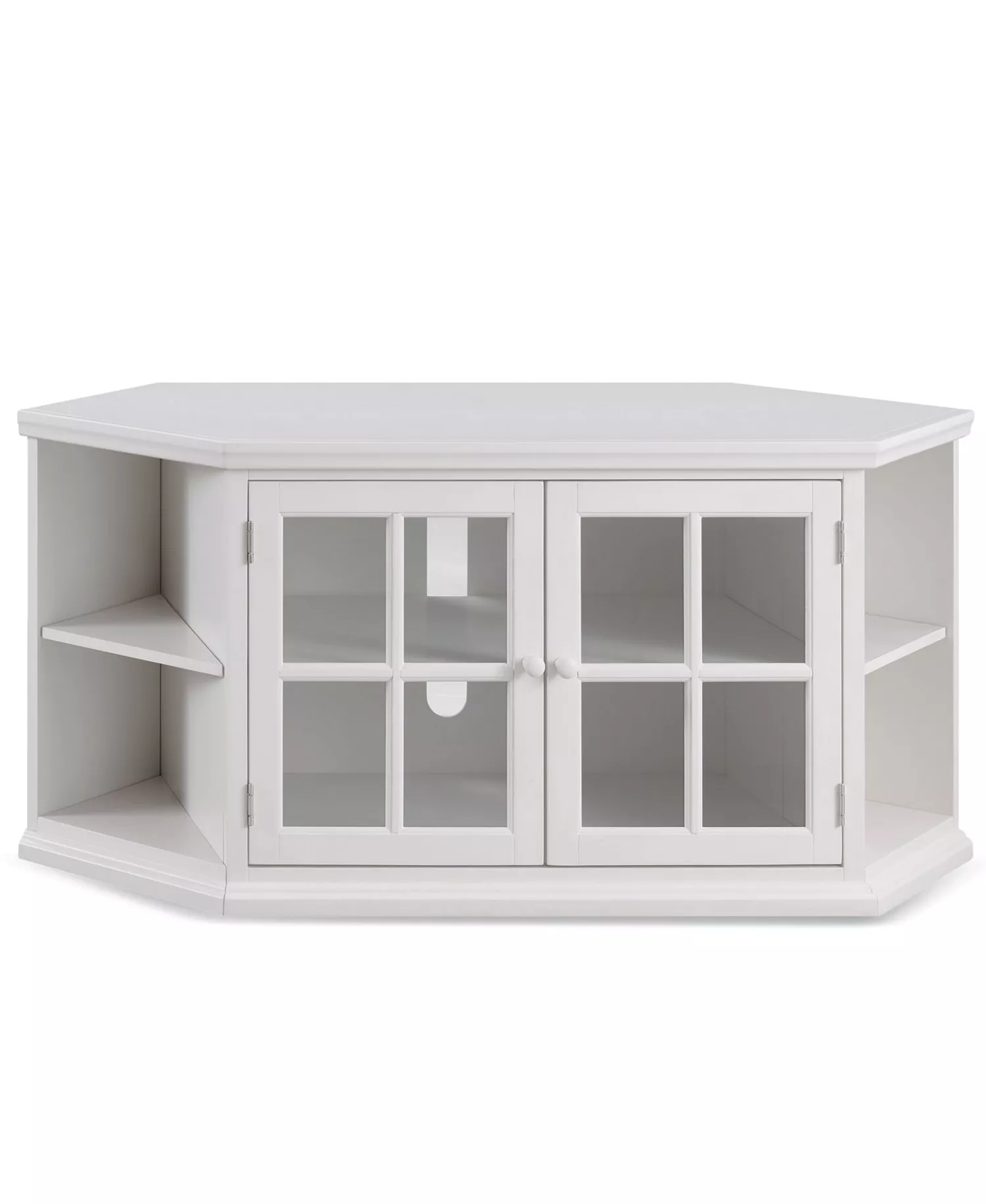 This 56″ Cottage White Corner TV Stand holds popular TV sizes from 32″ to 60″. Features include infrared friendly, bronze tinted door glass offering dust-free storage for electronics. A Chocolate cherry finish is applied to solid wood and wood veneers for a durable, protective finish.