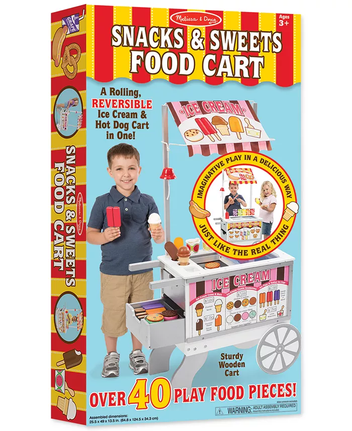 The possibilities are almost endless with this charming Melissa and Doug Snacks & Sweets Food Cart set. The set includes a sturdy wooden cart with a sliding top that allows kids to act out a variety of play scenarios—like a hot dog stand, ice-cream cart or mobile market—and it comes with over 40 play food pieces and a double-sided menu board to amp up the play-like-real fun. Features Recommended for ages 3+ Set includes wooden cart, over 40 play pieces and double-sided menu board Imported