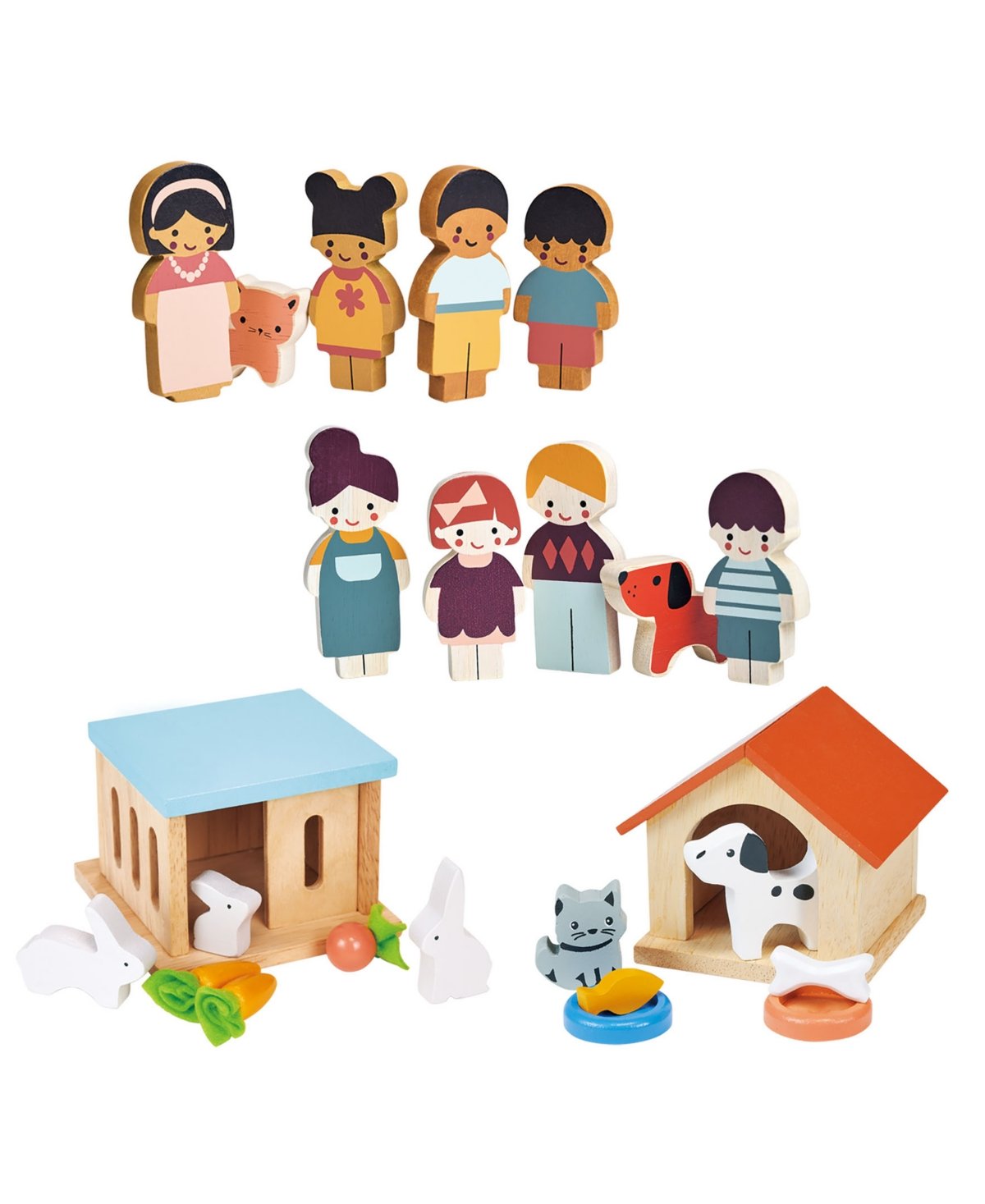 Welcome to the charming world of the ‘Doll Family Pets Bundle,’ where heartwarming playtime comes to life with wooden figures and their adorable animal companions.