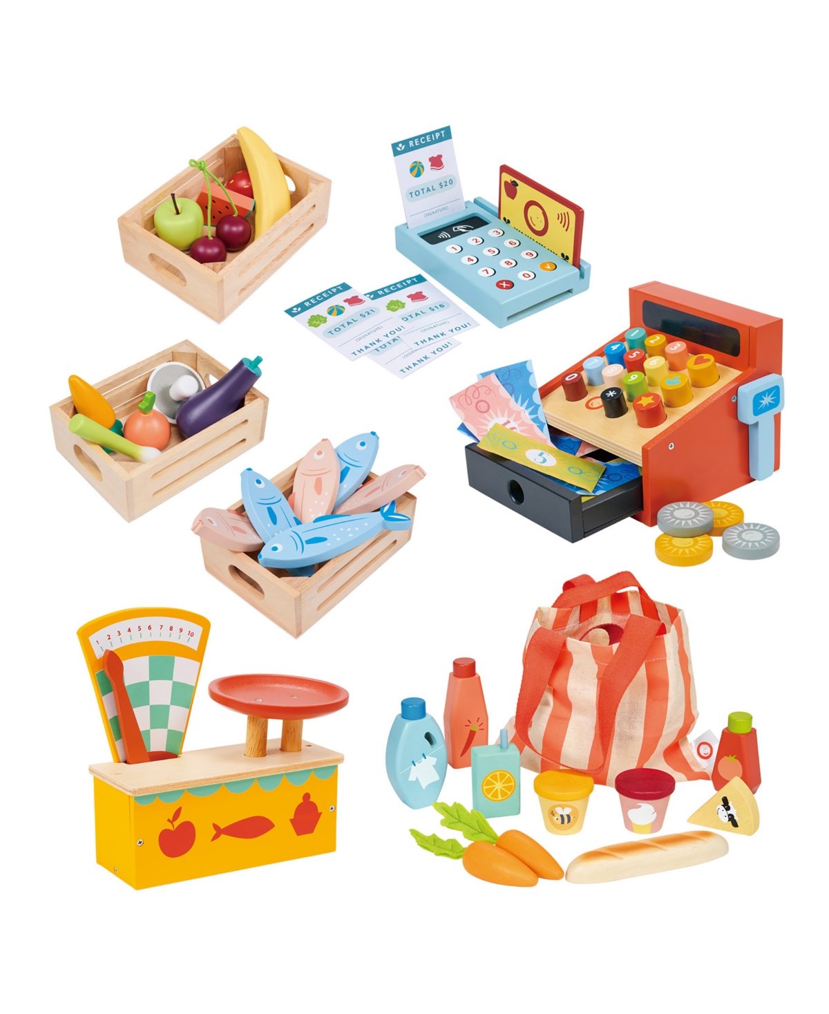 Adding a touch of realism, the ‘Bargain Grocery Bag’ is filled with wooden play food and pretend groceries, perfect for toting around the freshest produce from the ‘Allotment Crate’ and ‘Orchard Crate.’
