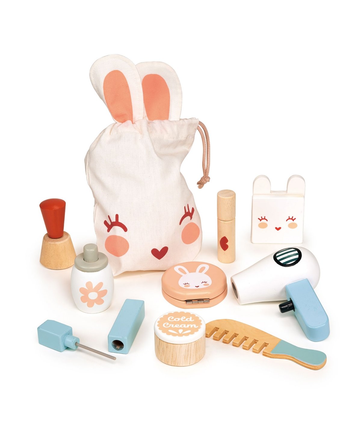 This bunny pretends to make up bag containing lipstick, nail varnish, cream pot, comb, hair dryer, mascara stick, eye shadow pallet, perfume bottle, powder puff with mirror.