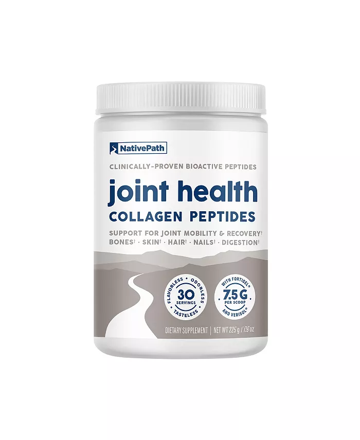 The Joint Health Collagen Peptides from NativePath contains 30 servings of grass-fed bovine collagen powder. It features two specific types of bioactive collagen: FORTIGEL and VERISOL. Supplementing with one scoop daily has been shown to help support joint health and skin, hair, and nails as you age. Each scoop offers 7.5 grams of grass-fed collagen, 18 amino acids, and type 1 and 3 collagen fibers. NativePath Joint Health Collagen Peptides is flavorless, odorless, and free from gluten, grains, dairy, soy, sugar, yeast, eggs, nuts, additives, and preservatives. Simply add 1-2 scoops to any hot or cold liquid and stir until completely dissolved. Suitable for the Paleo, Keto, or Whole30 diet. Each batch is third-party tested and manufactured in a certified GMP facility in the United States.