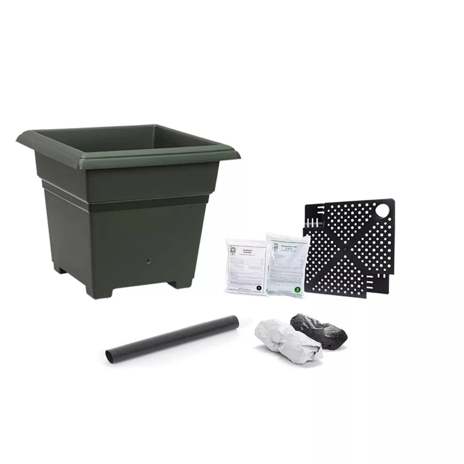Includes one EarthBox container with one aeration screen, one water fill tube, two black/white mulch covers, 16oz 8-3-5 organic fertilizer, 16 oz organic dolomite and instruction sheet