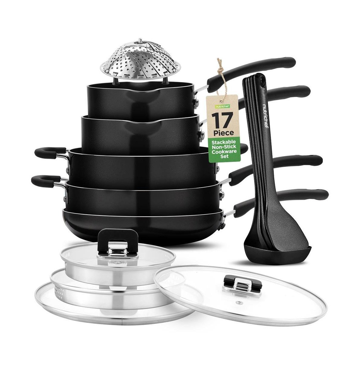 Kitchenware 17 Piece Non-Stick Cookware Set, Non-Stick Pans and Pots with foldable Knob, Space Saving, Stackable, Nylon Tools Set, Induction Base, Black (17-Piece Set)