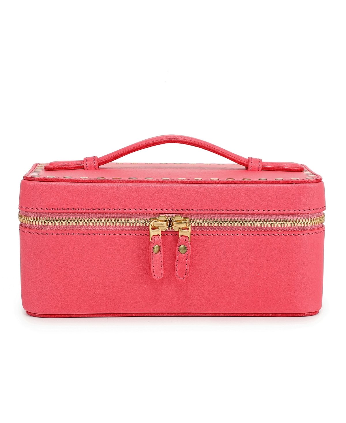 A timeless piece for your makeup, crafted from our distinctly smooth signature genuine leather. Open or closed, the unique solid brass studs and trims will always make a statement. Lightweight, solid, and secure, you’ll always have the confidence to take it with you on your travels.