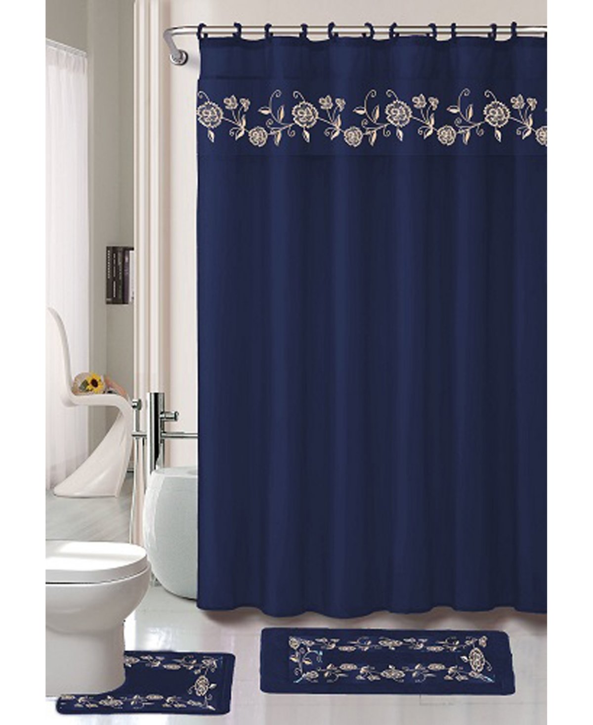 Set includes: shower curtain (70″ x 72″), twelve shower hooks (2.5″ x 4″ x 8″), two bath rugs (17″ x 24″ and 18″ x 30″), one bath towel (24″ x 48″), one hand towel (16″ x 24″) and one wash towel (12″ x 12″)
