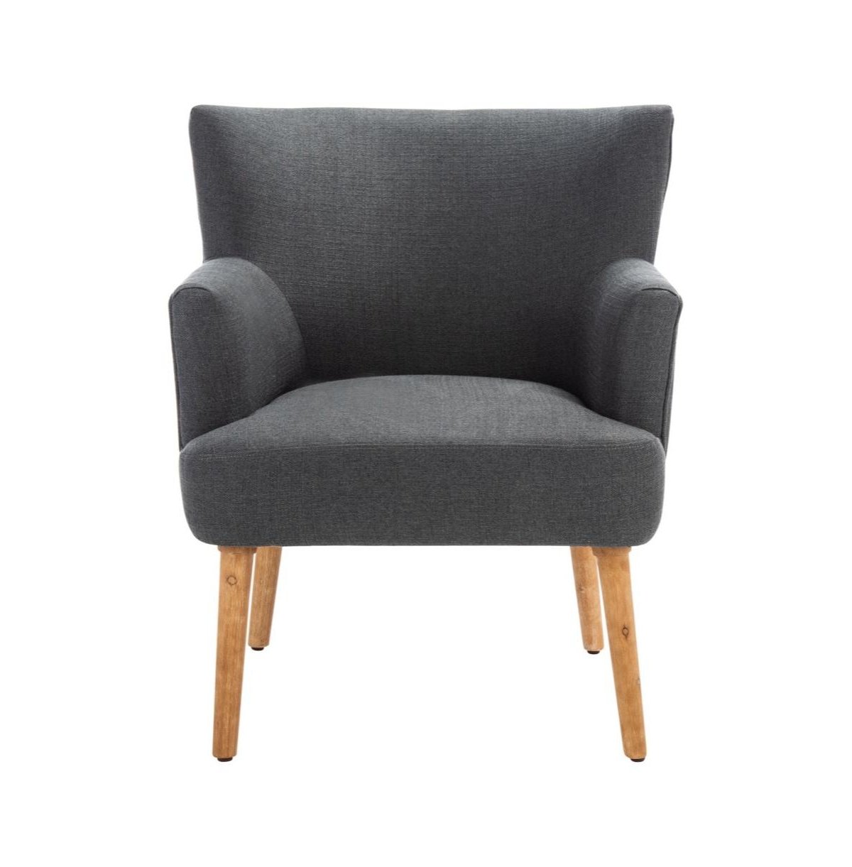 Give your decor a touch of Mid-Century chic with this Delfino Accent Chair. A subtly sculpted wingback silhouette and tapered legs beautifully reflect its retro inspirations, while its dark grey linen upholstery make it a modern style icon.