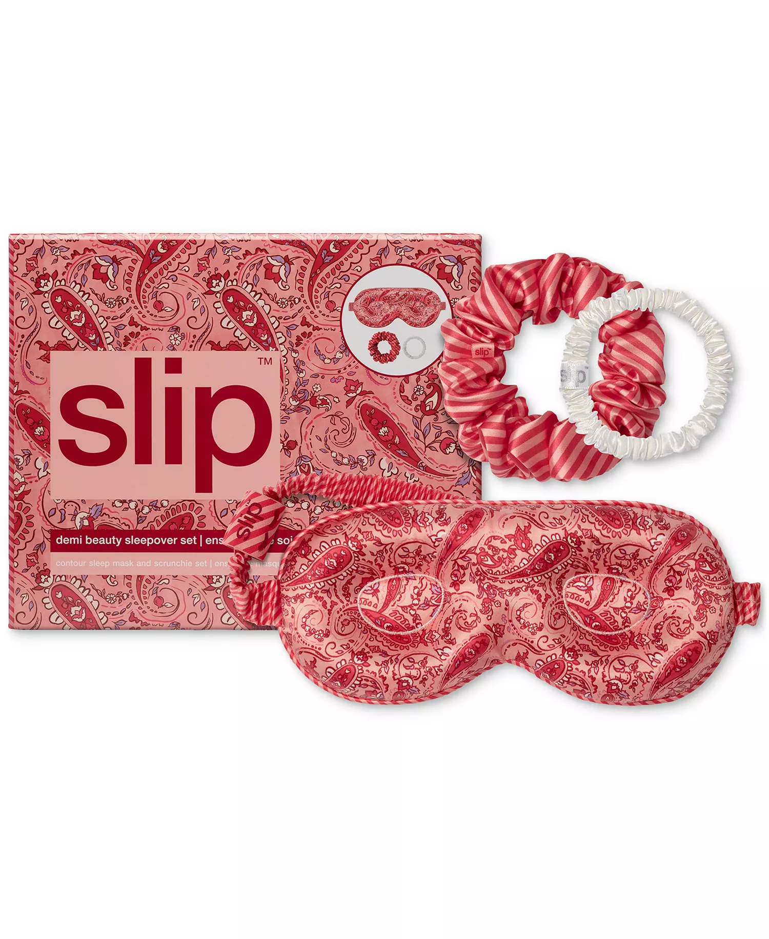 The beauty secret of celebrity hairstylists, dermatologists and beauty experts. Protect your lashes and your delicate hair with this limited-edition set. Beauty sleep with benefits. Slip pure silk products are made using slipsilk, developed and refined for more than ten years to provide the ultimate combination of shine, thickness, softness and durability. The Contour Sleep Mask has been specifically designed with delicate eyelash extensions in mind. While Slip has made all efforts to design the mask to be suitable for eyelash extensions, Slip acknowledges that not all lashes are the same and the Contour Sleep Mask may not be suitable for all lengths or types of lashes. Slip encourages you to use your own discretion in deciding whether the mask is suitable for you. The shape of the contour on the inside of the sleep mask has been designed to sit away from your eyelids and allow additional space for your eyelashes to sit while you get your beauty sleep. Slip scrunchies are designed to be anti-crease, anti-breakage. Traditional hair ties can tug on delicate hair, which can lead to damage and breakage. Slip scrunchies are made with slipsilk, the same silk used in the award-winning Slip Pure Silk Pillowcase. The multi award-winning Skinny Scrunchie is the perfect size for everyday use and won’t leave creases in your delicate hair. Or step up your hair tie game and switch to the Large Scrunchie. They are gentle on your delicate hair and fashionable at the same time.