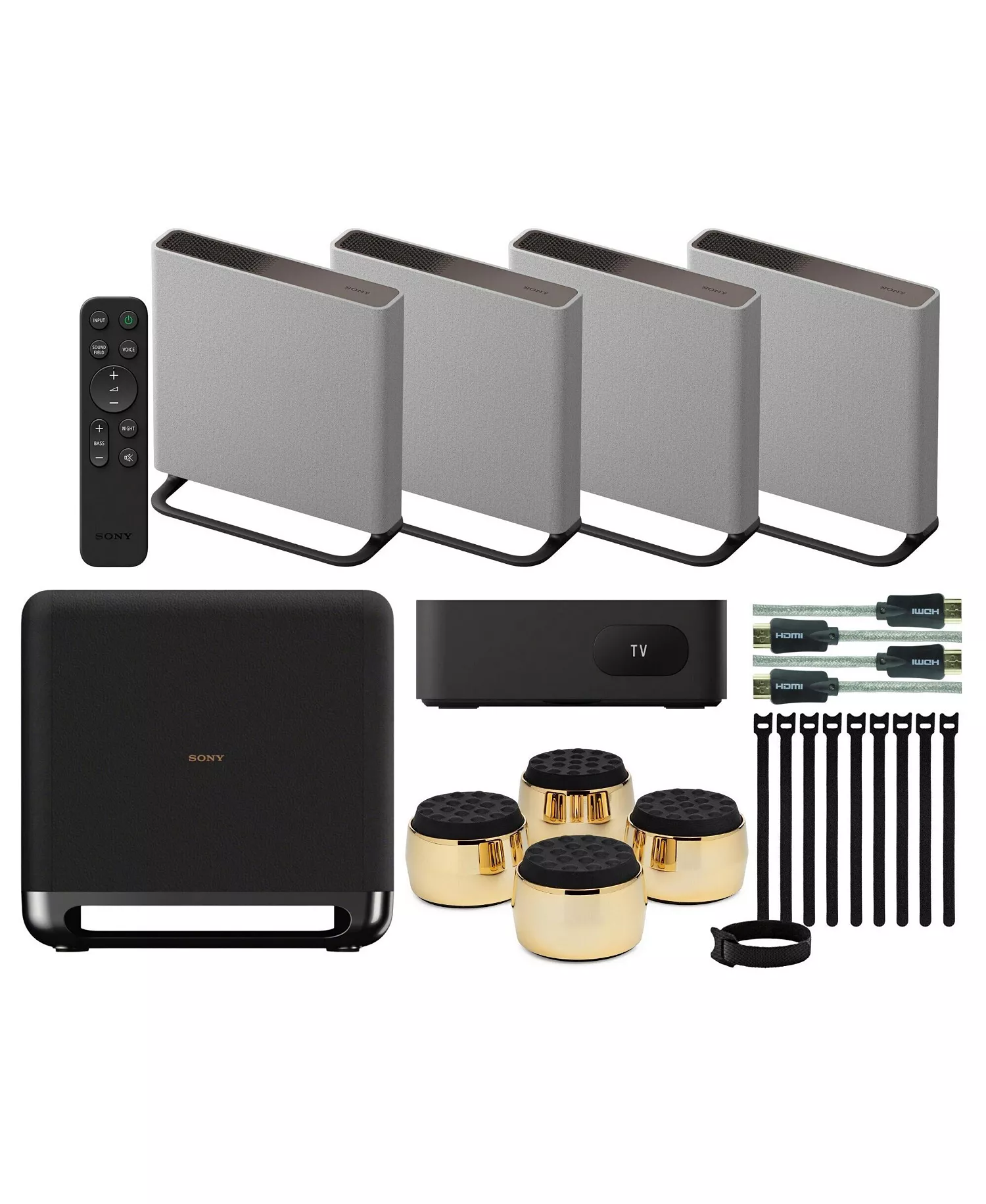 Declutter your office, living room or any electronics with the Focus Camera Hook-and-Loop Fastening Cable Ties (9-inch x 1/2-inch, 10-Pack). This set contains a Speakers (Gray), Control Box, Speaker (Front L, Front R, Rear L and Rear R), Remote Control, 2 x R03 (Size AAA) Battery, Common Base, 8 x Table Stand Leg, 8 x Table Stand Screw, 4 x Wall Bracket (L), 4 x Wall Bracket (R), 4 x Wall Hook, 8 x Screw, HDMI Cable (4K, 8K Transmission Supported), and Limited 1-Year Warranty.