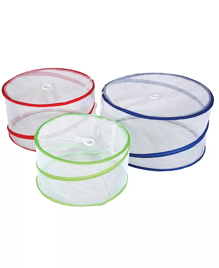 This set of 3 mesh food covers is made to keep insects and debris off food while you are enjoying outdoor meals. These food covers fold flat and pop up in an instant.