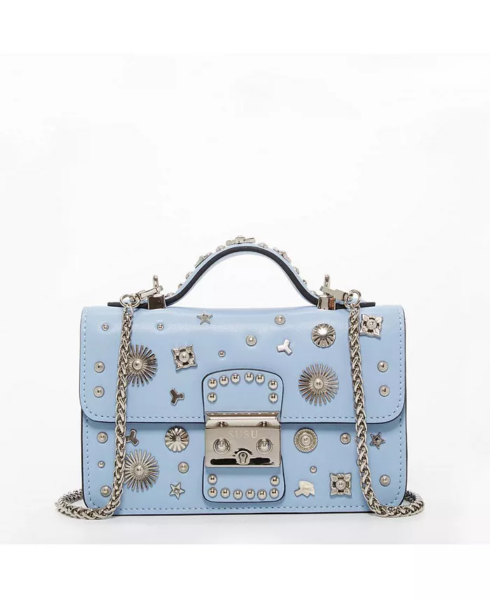 Turn heads with this light baby blue leather crossbody handbag from SUSU, designed with edgy silver-tone studs and modern embellishments for a bold, feminine look. The Baby Blue Hollywood bag features a structured boxy silhouette, detachable chain shoulder strap, and a sturdy top handle, offering versatile styling. A polished silver push-lock buckle secures the flap closure, adding sleek detail while protecting your essentials. Made from premium genuine leather, this stylish designer purse is both chic and practical. Inside, you’ll find a zippered pocket and slip pocket for effortless organization of your phone, wallet, keys, or cosmetics. From brunch dates to evening events, this statement handbag is the perfect mix of charm, confidence, and functionality. Ideal for women who love luxury handbags, studded shoulder bags, or trendy light blue fashion accessories.