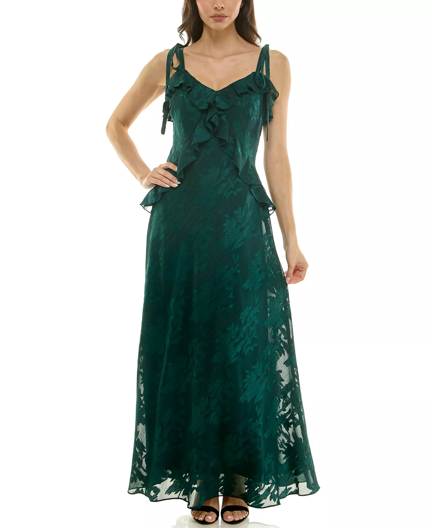 Flowing with a graceful sweetheart neckline, this long fit-and-flare dress is by Taylor. Delicate ruffles and a pull-on style create a captivating look for parties and special going-out events.