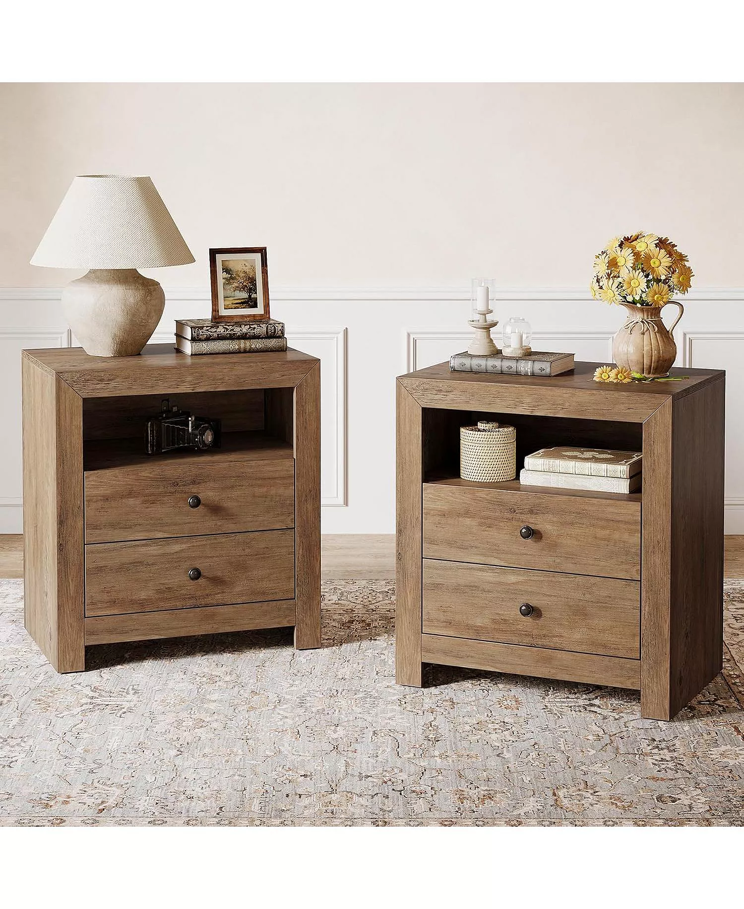 This nightstand includes 2 smooth-gliding drawers, 2 open storage shelf and a wide tabletop, providing spacious storage for your bedroom essentials like books, electronics, and personal items.