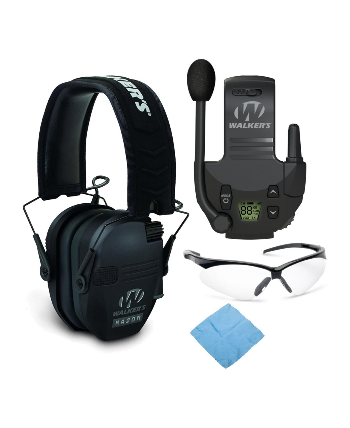 Protect your hearing from loud noise with the Walker s Razor Slim Electronic Muff. This set contains Walker’s Razor Slim Electronic Muff (Black), Walker’s Razor Tactical/Hunting Walkie Talkie Attachment, 2 x AAA Batteries, Walker’s Crosshair Sport Shooting Glasses (Clear), and 1-Year Limited Warranty.