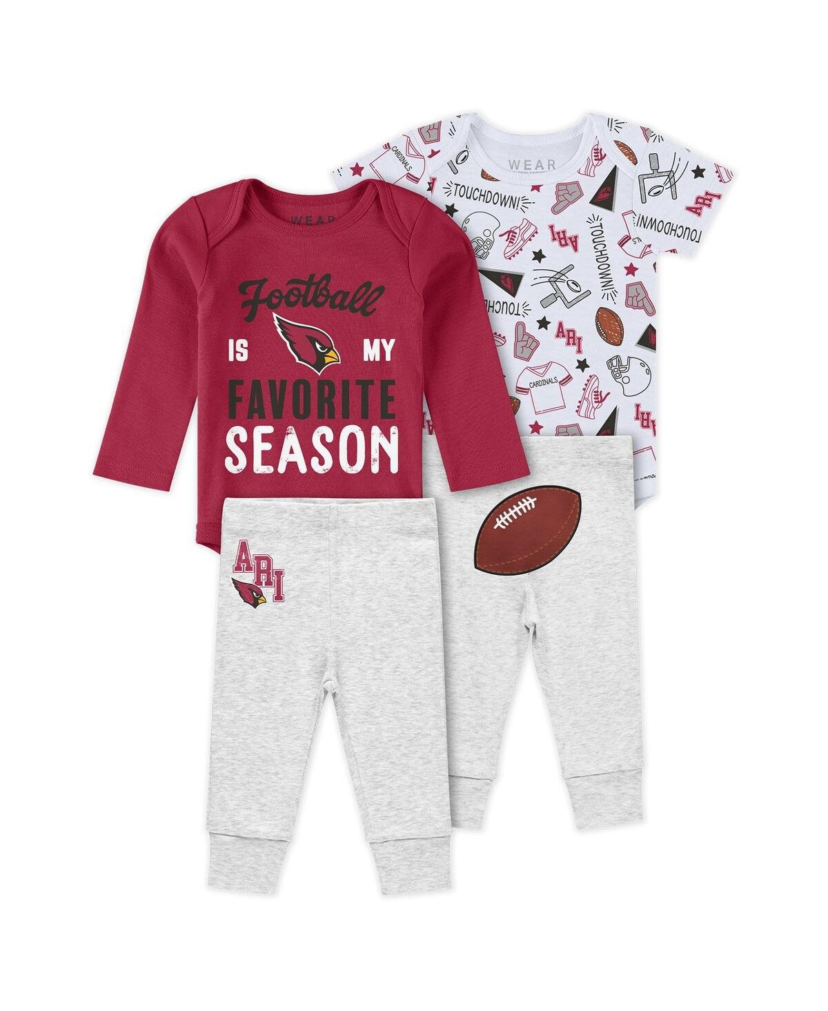Welcome the newest Arizona Cardinals fan with the WEAR by Erin Andrews Three-Piece Turn Me Around Bodysuits Pant Set. The long-sleeve bodysuit features a distressed screen-print graphic, while the short-sleeve option showcases an all-over team print, so your little one can rep the Cardinals in style no matter the occasion. This three-piece set makes an exceptional gift for any family welcoming a new Cardinals fan into the fold.